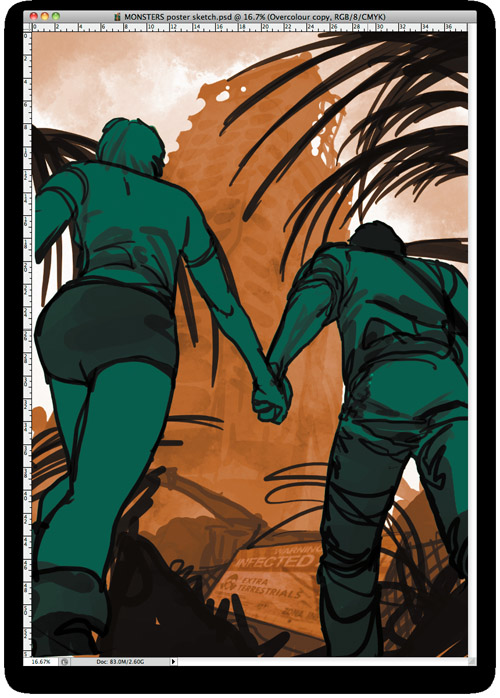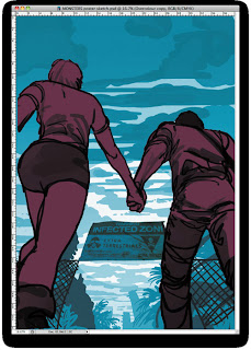 Different angle here. I liked the contrast between the warm hands which are like all lovey-dovey and sweet and nice and hopeful, with the cold blue mess of the wrecked jungle and the ominous signs of Monsters, such as the sign post and wrecked vehicles etc.