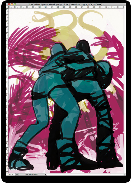 Earlier sketches were very different. I liked the romance aspect of the movie and initially went for a vibe that focused on that instead of the sci-fi-beasty aspect. When/if you see the movie you will see where I was coming from.