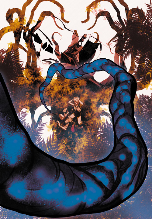 A slight variation, rehashing an earlier pose. This time showing them in the jungle as opposed to approaching it, with some dramatic up-shots of wrecked buildings. Personally I wasn't so hot on this, as I really liked the tension of the earlier images as the couple approach the dangerous zone. It made them more heroic and sorta showed that the bond between them was stronger. This looks like they're just a bit lost on safari.